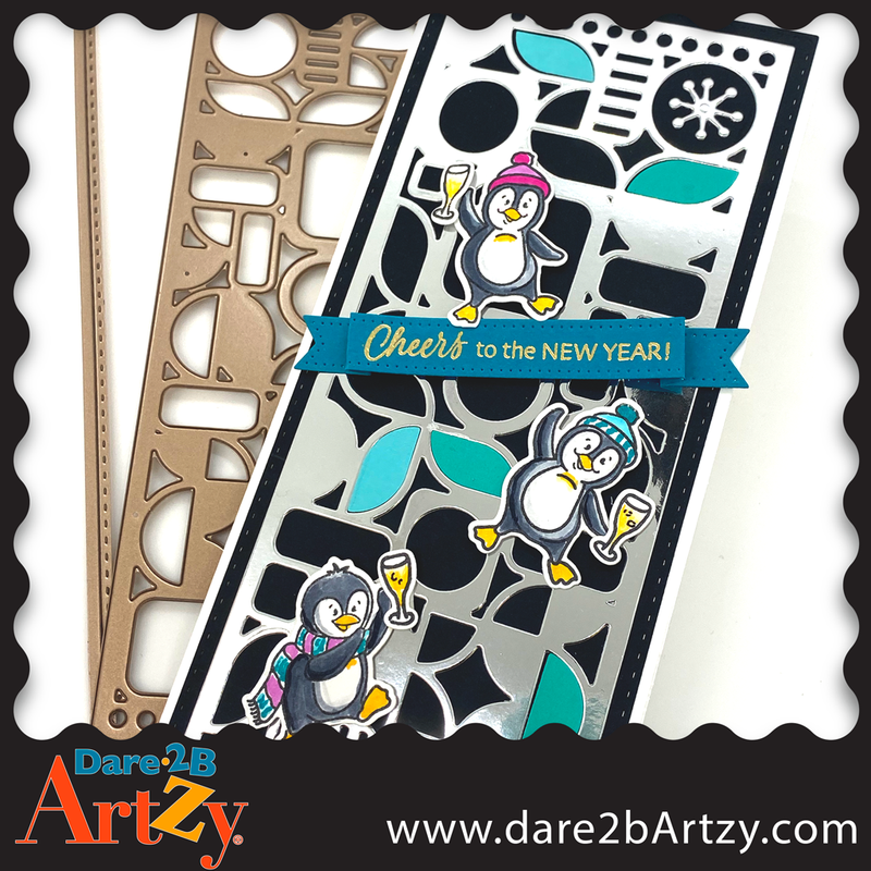 Our unique Retro die is perfect for a slimline style card that fits in a #10 envelope.  The set includes one large retro patterned background die, a stitched border die and 9 tiny dies for embellishing your project!